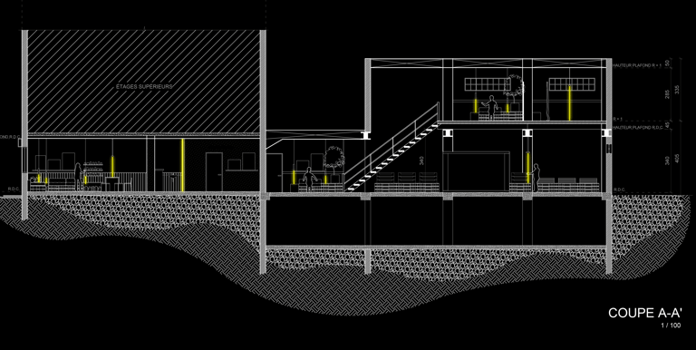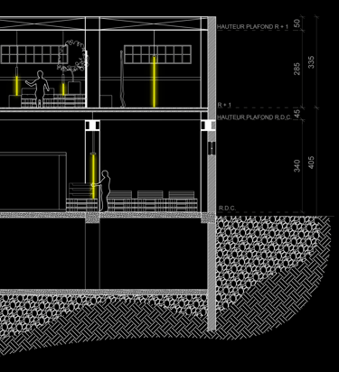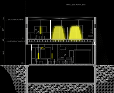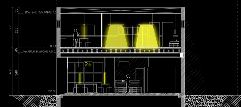 Dans le cadre de ce projet, j’ai réalisé le plan d’éclairage de l’état des lieux, à la fois pour le rez-de-chaussée et pour le R+1. Ce travail s’est appuyé sur une analyse précise de la lumière naturelle et artificielle existante, en utilisant un traitement en noir et blanc des photographies. Ce choix visuel permet de faire ressortir les points lumineux, en mettant en valeur les sources de lumière et les éléments qu’elles révèlent dans l’espace.