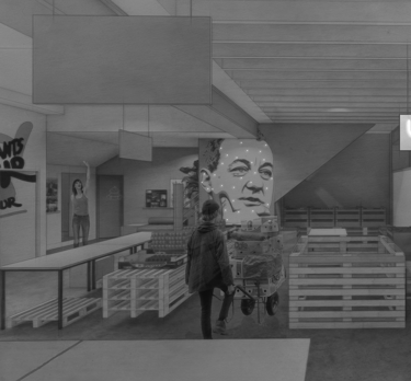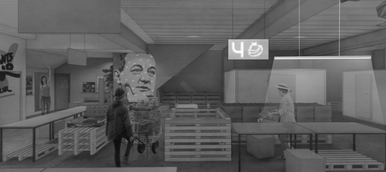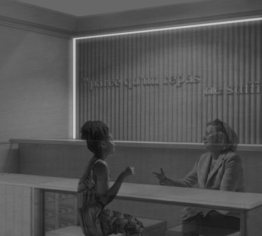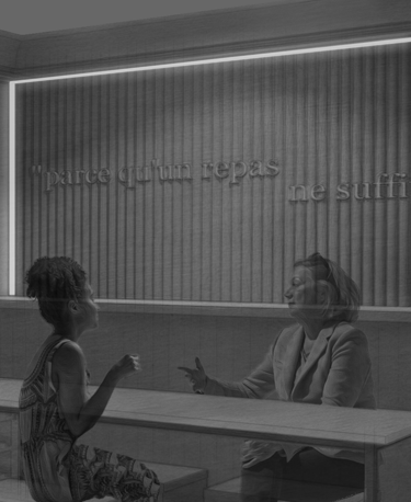 Pour renforcer l’identité du lieu et notamment le slogan des Restos du Cœur, j’ai installé, par encastrement, un bandeau LED. Celui-ci permet de "dessiner la lumière" dans l’espace, et offre une grande souplesse d’adaptation au plan, en épousant les formes et les courbes du lieu avec fluidité.