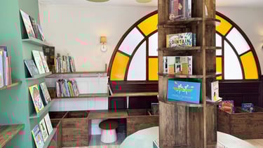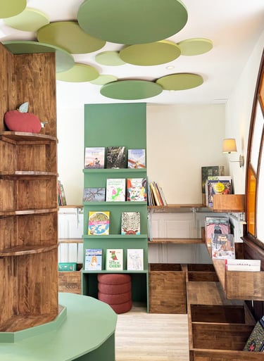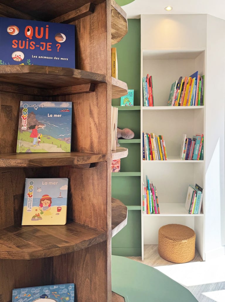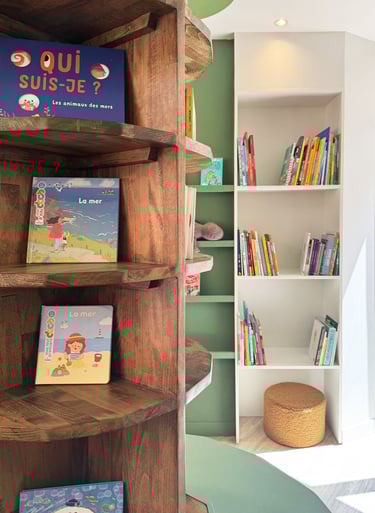 Cet arbre occupe le cœur de la salle et devient un véritable point de repère. Il ne s’agit pas seulement d’une structure décorative, mais d’un mobilier fonctionnel ! L’ensemble de l'espace, offre un choix multiple et ludique, invitant les jeunes lecteurs à explorer, fouiller et découvrir de nouveaux univers littéraires.