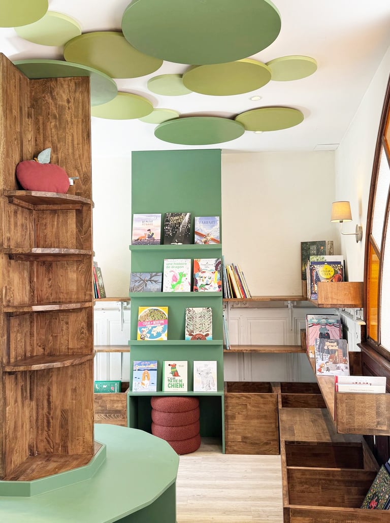 Le projet de rénovation de l’espace jeunesse de la librairie Au détour des mots à Tournon-sur-Rhône avait pour ambition de transformer totalement le lieu tout en révélant un élément architectural précieux : la verrière. Pour redonner vie à cet espace, j’ai imaginé un élément central fort et poétique : un arbre, symbole de connaissance et de croissance.