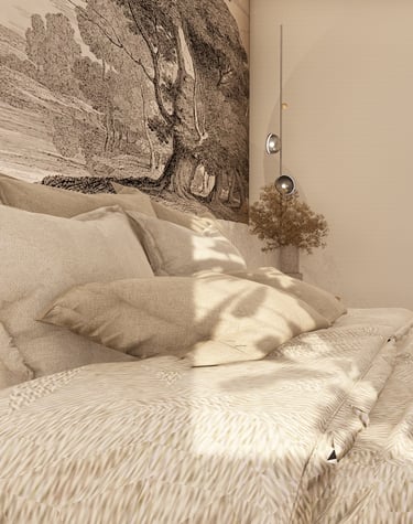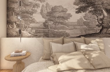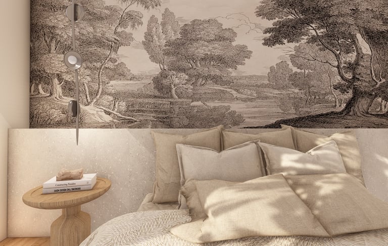 Un papier peint noir et blanc en toile de Jouy, placé en tête de lit, vient structurer et dynamiser la pièce. Son motif intemporel et délicat apporte une touche de caractère à cet écrin de sérénité, créant un subtil contraste avec les tonalités douces du reste de la suite.