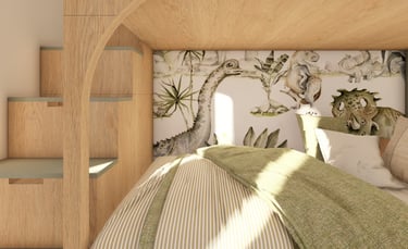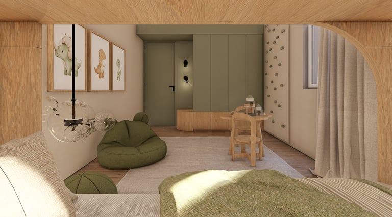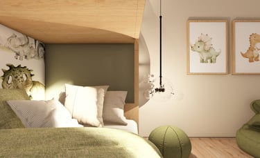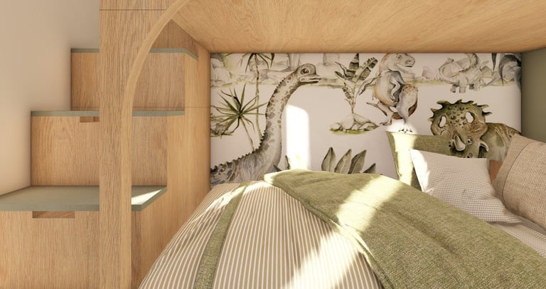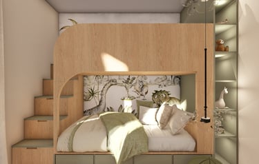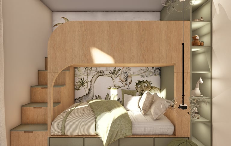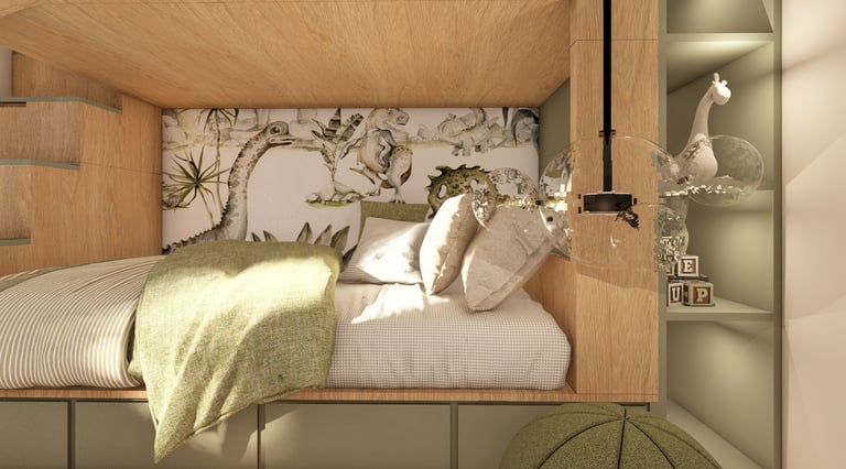 Cette chambre a été pensée pour accueillir deux jeunes garçons d’environ 10 ans, en alliant confort, praticité et imagination. Chaque détail a été conçu pour répondre à leurs besoins quotidiens tout en créant un univers propice à l’évasion et au jeu.
